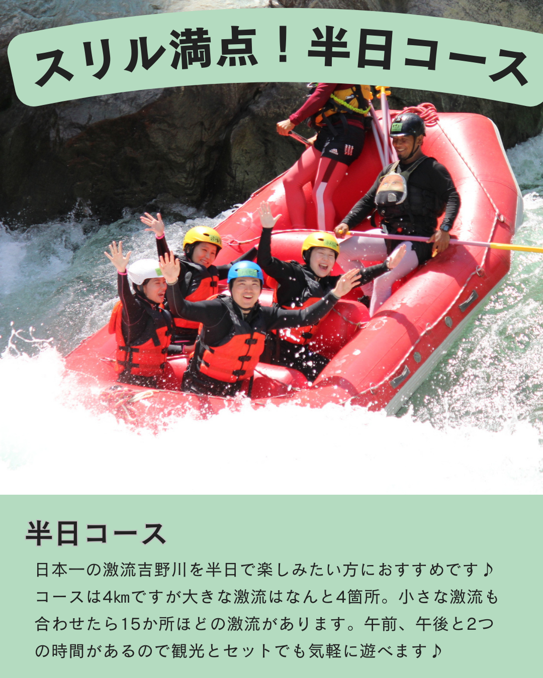 半日といっても距離は4キロもあり大きな激流は4箇所もあります。そして小さな激流も入れたら15か所ほどの激流が待ち受けています!小さな激流ではゲームをしたり遊んだりして下ります。また、これがボート上のみんなで盛り上がれて楽しいんです(^^)/