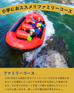 ファミリーコースは小学1年生から遊べるコース設定をしていますので、大きな激流はないので小学生のかたも安心して参加できます!激流よりも遊びがメインになるこちらのコースはボートを使って、ゲームをしたり、スライダーをしてみたり、岩からのジャンプなどもあります。お子さんの新たなチャレンジに今まで見たことない姿を見ることができるかもしれません!