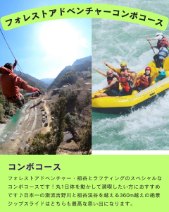 フォレストアドベンチャー・祖谷とのコンボコースは半日はラフティング、半日はフォレストアドベンチャー・祖谷を1日大満喫できるコースです!フォレストアドベンチャー・祖谷では31種類のアスレッチックと360m越えのロングジップスライドを2本体験できます!また、日をまたいでの参加もできますのでお気軽にお尋ねください♪